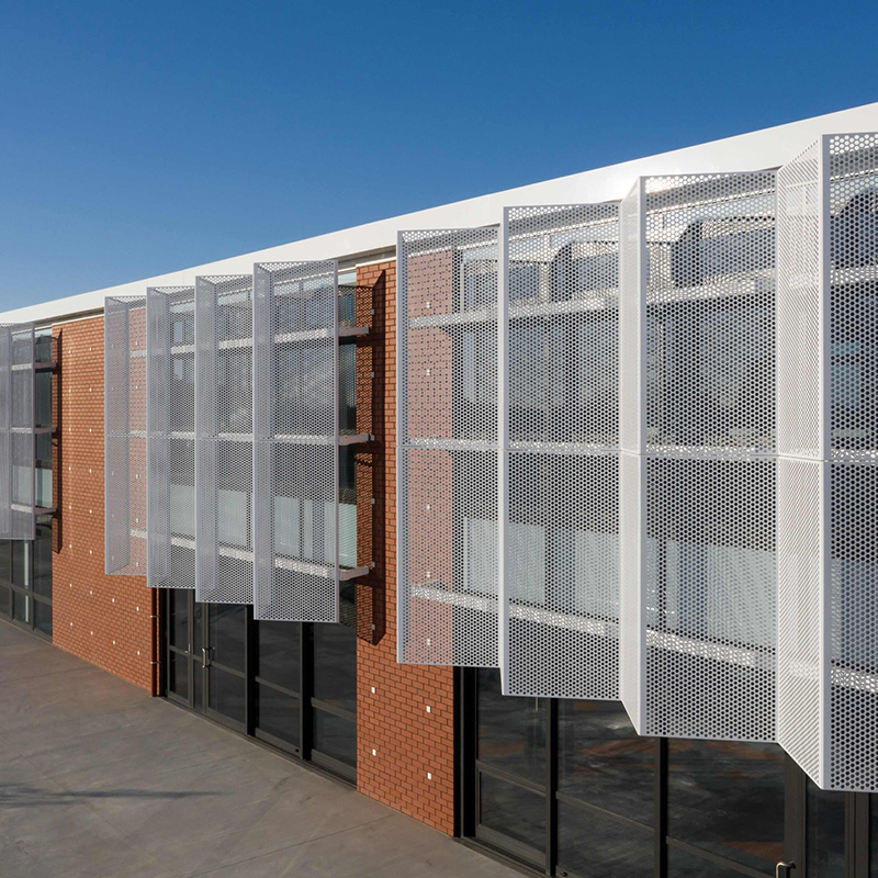 穿孔金屬板廣泛用于外部陽光控制系統。 為此,面板使人們享受舒適的工作環境而不會刺眼的陽光,并保持空氣流入建筑物并調節溫度。 此外,這種采用也為建筑外墻增添了活力。 穿孔金屬防曬霜的最佳選擇材料是鋁或鋁合金。 成品具有很高的強度重量比,即使在長期的陽光照射下也能抵抗老化。